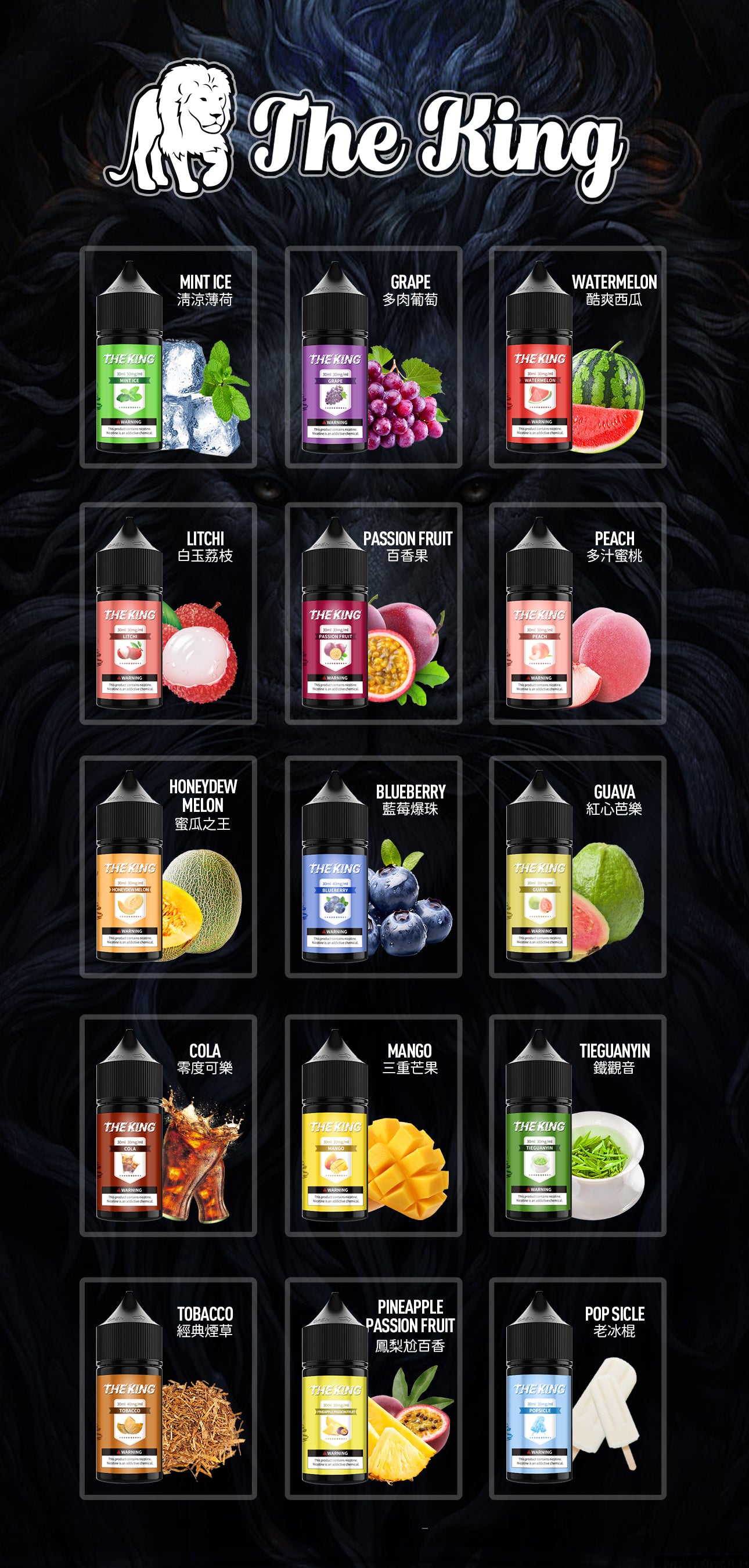 無論是清新的水果口味,還是濃郁的甜品風味,The King 的每一款口味都是一段美妙的旅程,帶領您在口腔中漫遊。選擇 The King 王者煙油,讓您在煙霧飄渺中,感受到貴族般的享受與尊榮。每一瓶30ml的煙油,都是對生活品味的完美詮釋。